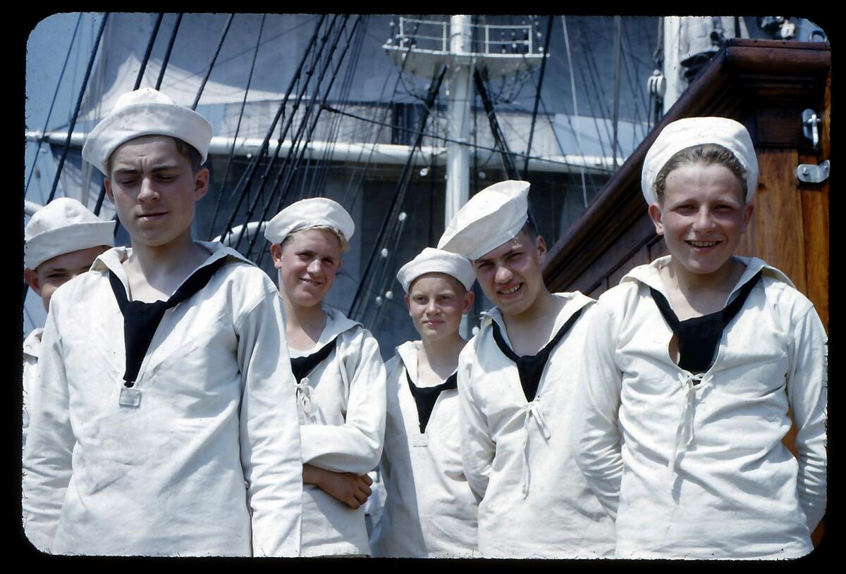 Skoleskipsgutter på Statsraad Lehmkuhl, 1950-tallet. Bergens Sjøfartsmuseum / stiftelsen Museum Vest.