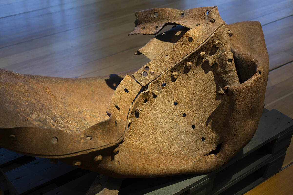 Fra krigsutstillingen; en vrakdel fra skipet Voorbode som eksploderte ved Festningskaien i Bergen sentrum 20. april 1944 og forårsaket store ødeleggelser. Foto: Silje Katrin Robinson / Stiftelsen Museum Vest.