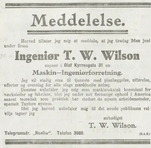 To år etter hjemkomsten til Bergen starter han opp Vestlandets første automobilforretning og maskinfirmaet Ingeniør T. W. Wilson. Han gifter seg også med sin forlovede Amy Jersin. Jersins norske familie hadde utvandret til Minnesota og Jersin var født der. Familien returnerte senere til Bergen.