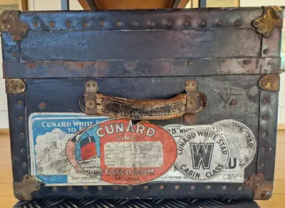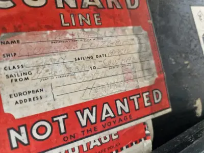 Ta en nærmere kikk på bagasjelappene. Hva kan disse fortelle oss om Wilsons reiser? Vi kan se at han har reist flere ganger med RMS Queen Elizabeth, som fra 1946 gikk som passasjerskip mellom Southampton og New York for Cunard-White Star Line. En av lappene er tydelig merket mai 1952. De andre to er vanskeligere å lese, men kan se ut til å være merket april 1954.