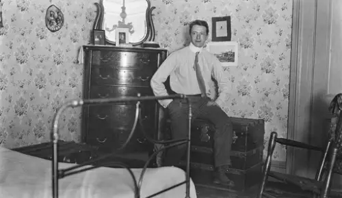 • Truls Wilson med en av sine amerikakofferter (nå utstilt på Bergens Sjøfartsmuseum) i hans første leilighet i USA, 378 Dean Street, New York. Foto: Truls Wilson/Universitetsbiblioteket i Bergen